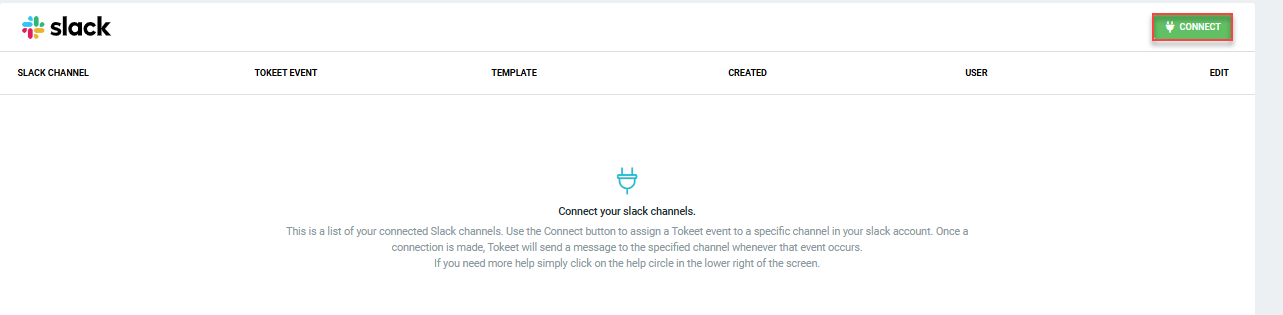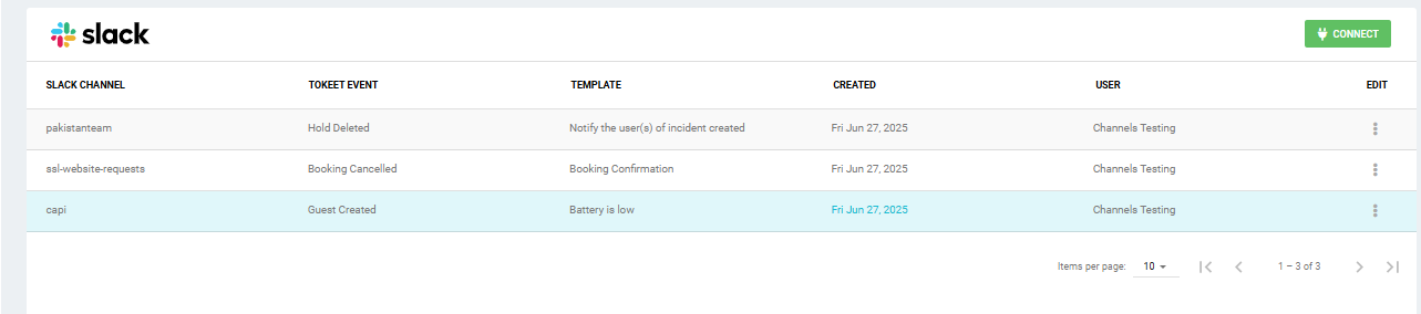Your Slack connection is now listed. You can create as many Slack connections as you'd like, for example if you'd like to track different Tokeet events in different Slack channels.
